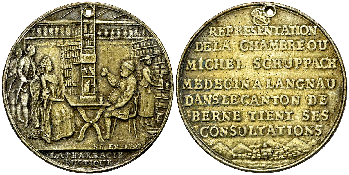 Schweiz, Bern. Langnau. Vergoldete AR-Gussmedaille o.J. (50 mm, 34.31 g), auf Michael Schüpbach (1707-1781), Naturarzt in Langnau im Emmental. Av. Landpraxis, darin rechts an Tisch der Wunderdoktor, links Patienten von Stand; an Bodenleiste NE EN 1707; im Abschnitt LA PHARMACIE / RUSTIQUE. Rv. Unter Bernerwappen REPRESENTATION / DE LA CHAMBRE OU / MICHEL SCHUPPACH / MEDECIN A LANGNAU / DANS LE CANTON DE / BERNE TIENT SES / CONSULTATIONS. Haller 272; Slg. Brettauer 1140; SM 773 (dieses Exemplar).