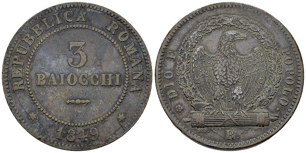 Lot 334. Repubblica Romana, CU 3 Baiocchi 1849 R