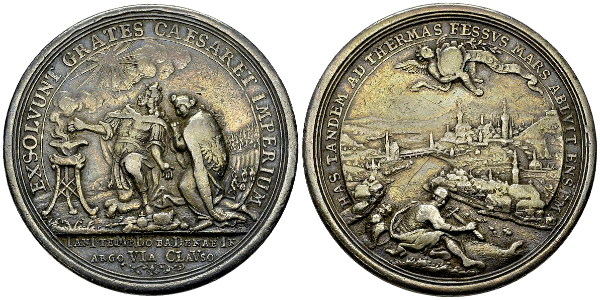 IANI TEMPLO BADENAE IN / ARGOVIA CLAVSO / Arabeske. Rv. HAS TANDEM AT THERMAS FESSVS MARS ABLVIT ENSEM, Ansicht von Baden und der Limmat, darunter wirft Mars ein Schwert in den Fluss,