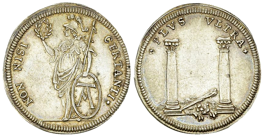 sie einen Kranz. Rv. PLVS VLTRA, Zwei Säulen (des Herkules), dazwischen
