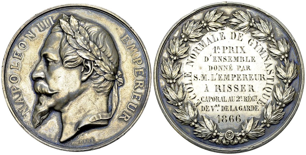 France, 2nd Empire. Napoléon III. Médaille en argent 1866 (51 mm, 63.04 g), Ecole normale de gymnastique, 1.R PRIX/ D'ENSEMBLE/ DONNE PAR / S.M. L'EMPEREUR / À RISSER / CAPORAL AU 2E REGT / DE V.RS DE LA GARDE / 1866. Poinçon ARGENT.