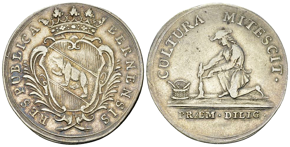 Rv. CULTURA MITESCIT ·, Kniender Gärtner nach links, einen jungen Baum einpflanzend; im Abschnitt PRÆM · DILIG ·.