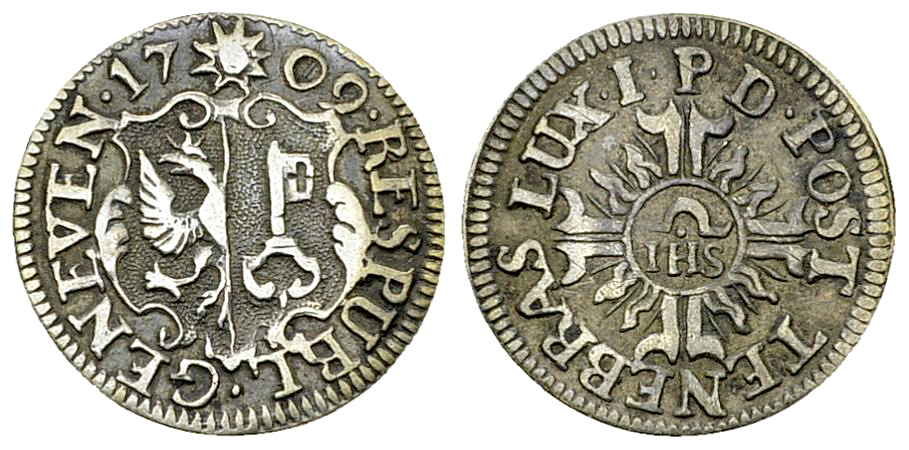 Schweiz, Genf/Genéve. Silberabschlag des 2 Quarts (1/2 Sol oder 6 Deniers) 1709 (0.98 g). Richter (Proben) 1-317; HMZ 2-351b, Anm.