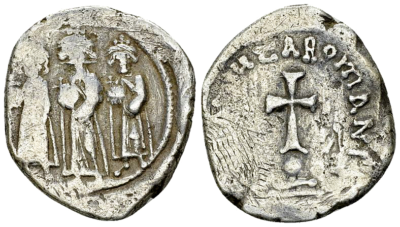 Heraclius (610-641 AD). AR Hexagram (22-24 mm, 6.57 g), Constantinopolis, 637-641. Obv. Heraclonas, Heraclius, and Heraclius Constantine standing facing, each