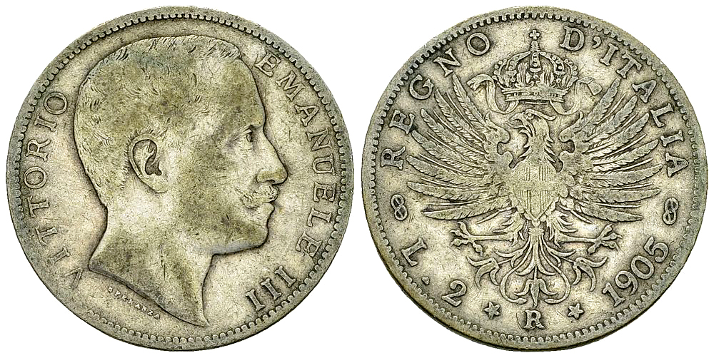 Italia. Vittorio Emanuele III. AR 2 Lire 1905 R (9.87 g), Roma. Aquila.