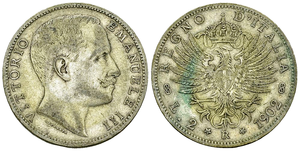 Italia. Vittorio Emanuele III. AR 2 Lire 1902 R (9.90 g), Roma. Aquila.