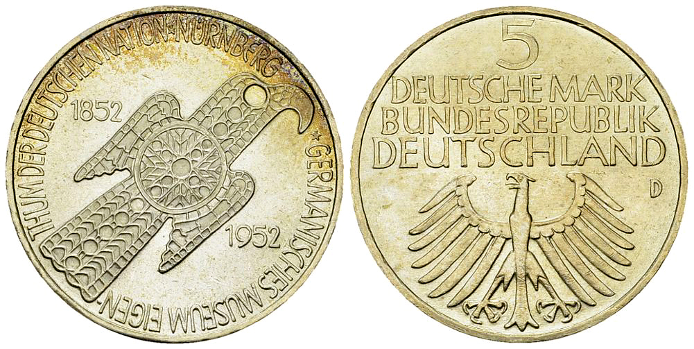 Lot 213. BRD, AR 5 Mark 1952 D, Germanisches Museum
