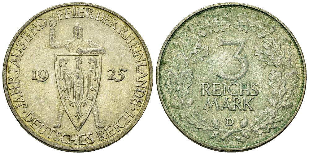 Los 184. Weimarer Republik, AR 3 Reichsmark 1925 D, Rheinlande