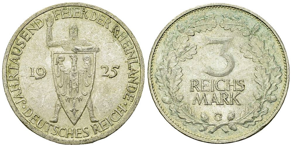 Deutschland, Weimarer Republik. AR 3 Reichsmark 1925 G (14.92 g), Rheinlande.