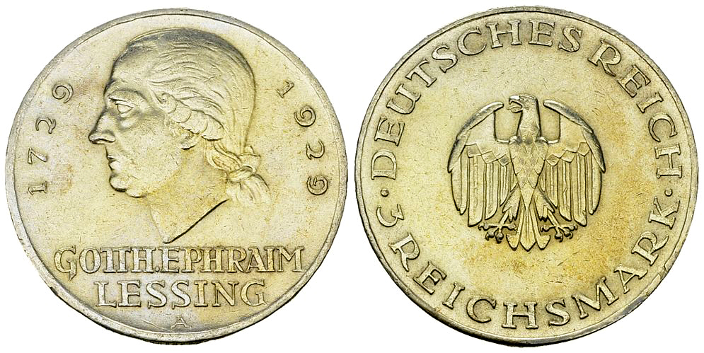 Lot 195. Weimarer Republik, AR 3 Reichsmark 1929 A, Lessing