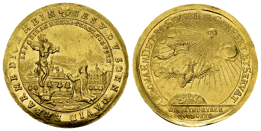Dukat 1745 (3.43 g), auf seinen Tod. Datierung in der Legende in Chronogramm. Kreuzigungsszene. Fr. 3010; KM 30.