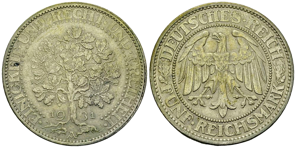 Lot 208. Weimarer Republik, AR 5 Reichsmark 1931 A, Eichbaum