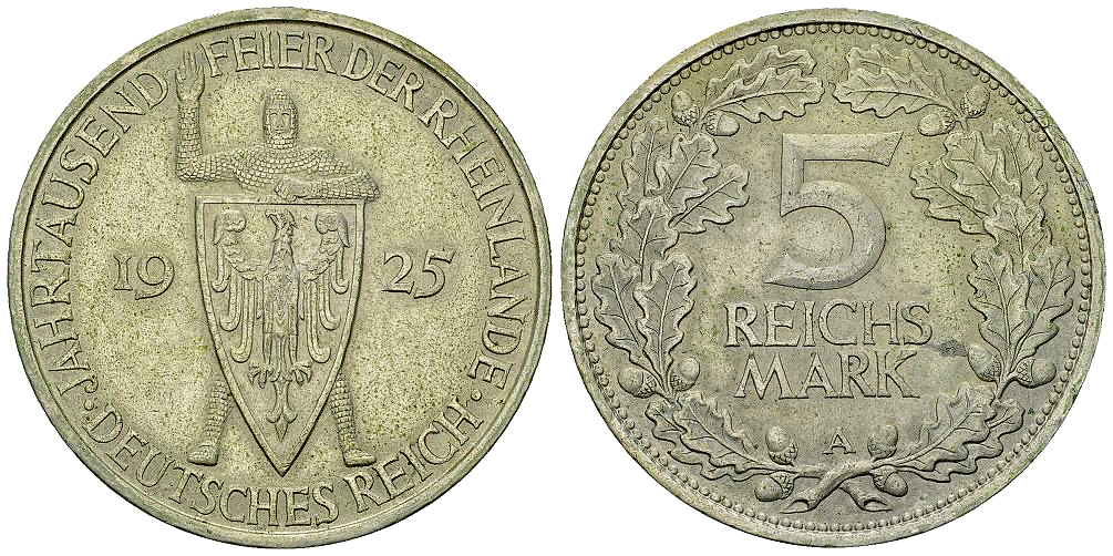Lot 186. Weimarer Republik, AR 5 Reichsmark 1925 A, Rheinlande