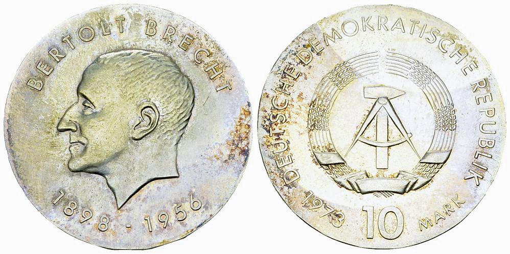 Deutsche Demokratische Republik DDR. AR 10 Mark 1973 (A) (16.99 g), Brecht.