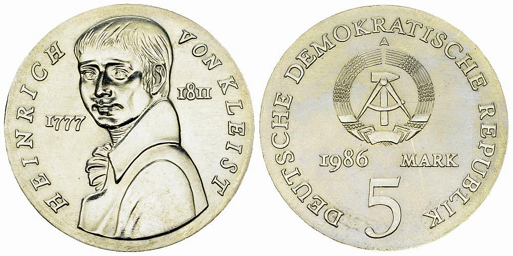 Deutsche Demokratische Republik DDR. NI-ME 5 Mark 1986 A (12.28 g), Heinrich von Kleist.