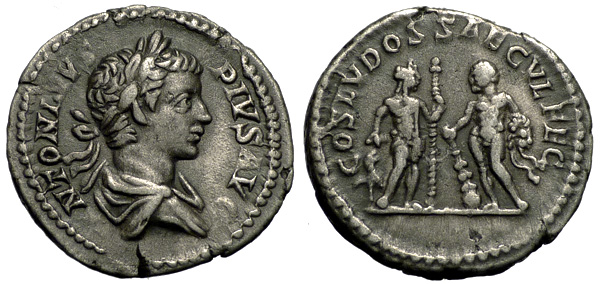 Caracalla (198-217 AD). AR Denarius (18-19 mm, 3.96 g), Roma (Rome) 204 AD. Obv. ANTONINVS PIVS AVG, Laureate and draped bust right. Rev. COS LVDOS SAECVL FEC, Bacchus, on left, standing right, holding cup and thyrsus; facing him, Hercules on right, standing left, holding club and lion-skin; at feet of Bacchus, left, panther. RIC IV, p. 223, 74a (R2).