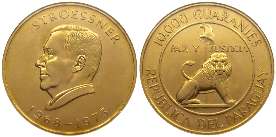 Paraguay. Republic. AV 10.000 Guaranies 1968 (46.01 g). President Stroessner, on his 4th term. KM 30.