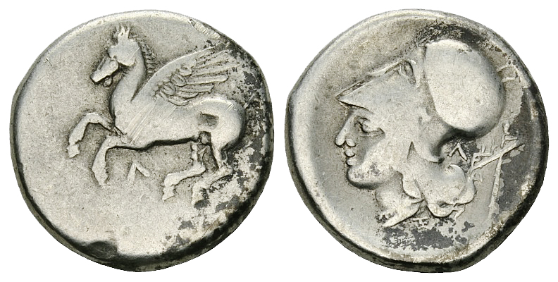 Leucas, Acarnania. AR Stater (21 mm, 8.29 g), c. 300 BC. Obv. Pegasos flying left, Λ below. Rev. Head of Athena left, wearing Corinthian helmet; behind, Λ and stylis. Pegasi 132; BCD 269.
