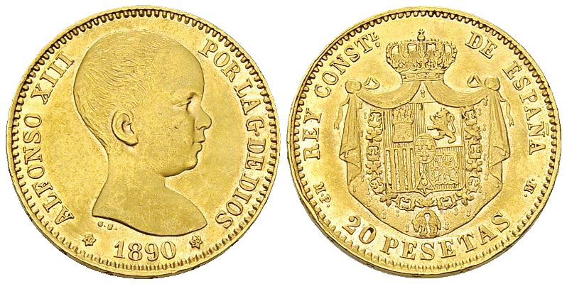 Spain. Alfonso XIII (1886-1931). AV 20 Pesetas 1890 (1890) (6.41 g). KM 693.