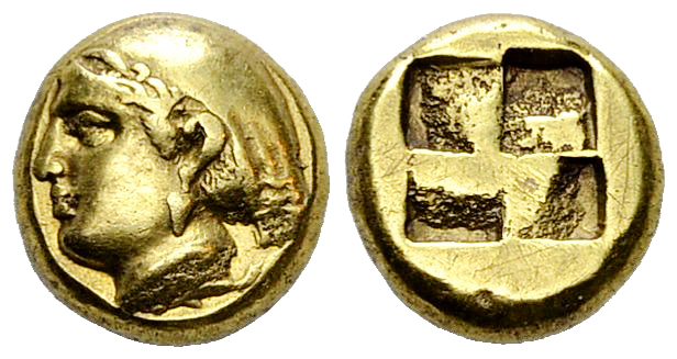 Phokaia, Ionia. EL Hekte (10 mm, 2.50 g), c. 387-326 BC. Obv. Head of Aphrodite left, hair in chignon; seal below. Rev. Quadripartite incuse square. Bodenstedt Em. 98.