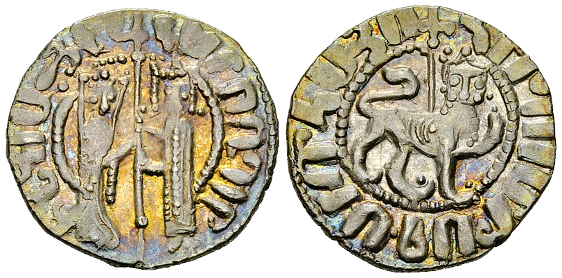 Armenia. Hetoum I and Zabel (1226-1271). AR Tram (20 mm, 2.96 g). Obv. Standing figures facing of Hetoum and Zabel, both wearing crowns and holding between them long cross. Rev. Crowned lion to right, head facing, patriarchal cross behind. Beoudkian 981.