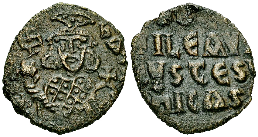 Theophilos (829-842 AD). AE Follis (23-24 mm, 8.21 g), uncertain provincial mint. Obv. ΘEOFIL bASIL, facing king, draped and crowned, holding labarum and cross on globe. Rev. + ΘEO/FIL E AVG/OVSTES V / nICAS. Sear 1685.