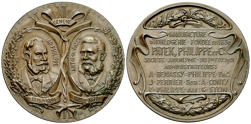 Genf, Schweiz. AE Medaille 1901 (37 mm, 23.87 g), auf die neue Namensgebung der Firma Patek Philippe. Brustbilder von Jean Adrien Philippe und Antoine Norbert de Patek. Martin 690.