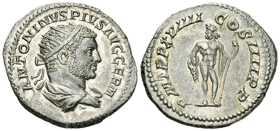 Caracalla (197-217 AD). AR Antoninianus (24 mm, 5.67 g), Roma (Rome), 216. Obv. ANTONINVS PIVS AVG GERM, radiate, draped and cuirassed bust right, seen from behind. Rev. P M TR P XVIIII COS IIII P P, Jupiter standing facing, head left, holding thunderbolt and sceptre. RIC 275b.
