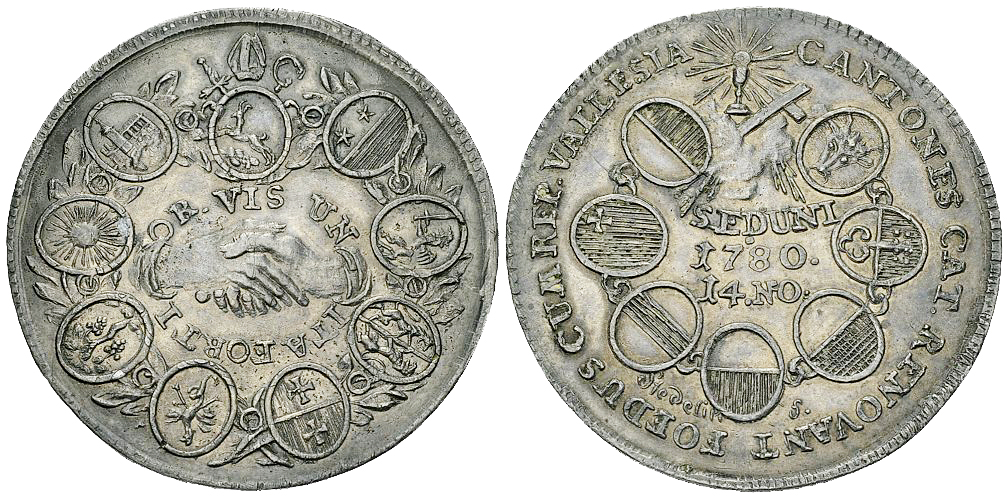 Wallis, Kanton. 2 einseitige Zinnabschläge der Medaille 1780 auf das Bündnis der sieben katholischen Orte mit der Republik Wallis (38 mm, 8.90 und 6.08 g). Vgl. SM 29.