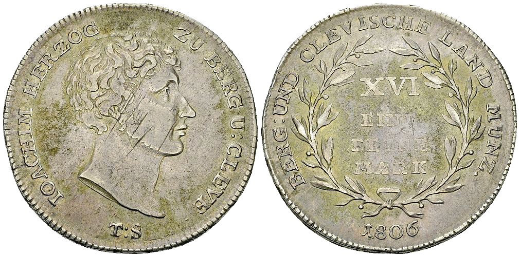 Deutschland. Jülich-Kleve-Berg, Herzogtum, seit 1806 Grossherzogtum. Joachim Murat (1806-1808). AR Taler 1806 (36 mm, 19.38 g), Landmünze. AKS 9; Dav. 624; Kahnt 137; Thun 110.