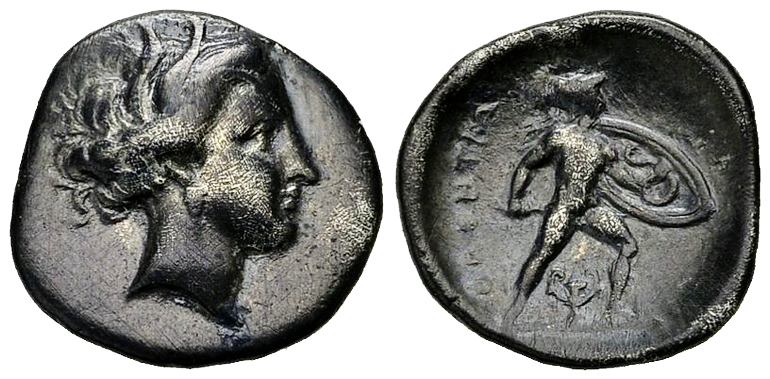 Lokris, Lokri Opuntii. AR Triobol (17 mm, 2.37 g), c. 330's BC. Obv. Head of Demeter right, wearing wreath of grain ears Rev. OΠONTIΩN, Ajax advancing right, nude but for crested helmet, brandishing sword and shield; kantharos between legs. BCD Lokris 99; De Luynes 1958.