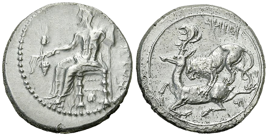Mazaios, Persian Satrap of Cilicia (361/0-334 BC). AR Stater (24 mm, 10.81 g), Tarsos. Obv. Baaltars seated left, holding grain ear, grapes, and scepter; below throne, applustre (?). Rev. Lion attacking stag left; Aramaic M to lower left. SNG Levante 110.