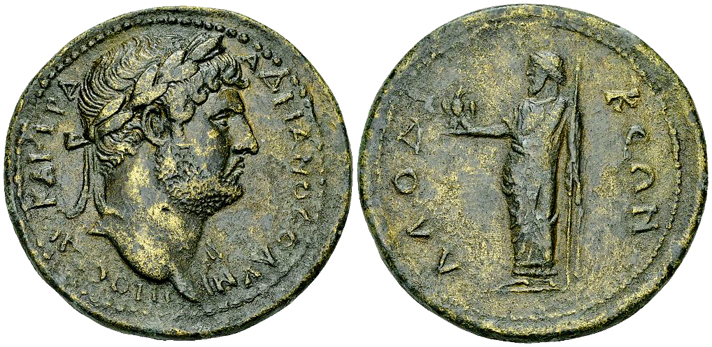 Hadrianus (117-138 AD). AE Medallion (38 mm, 36.30 g), Laodikeia on the Lykos, Phrygia. Obv. AY KAI TPA AΔPIANOC OΛYMΠOC, laureate head to right, drapery on left shoulder. Rev. ΛAOΔIKEΩN, Zeus Laodikeos standing left, holding long sceptre in left hand and eagle in his right. BMC 195. RPC III 2329.5 (this coin, illustrated on pl. 104).