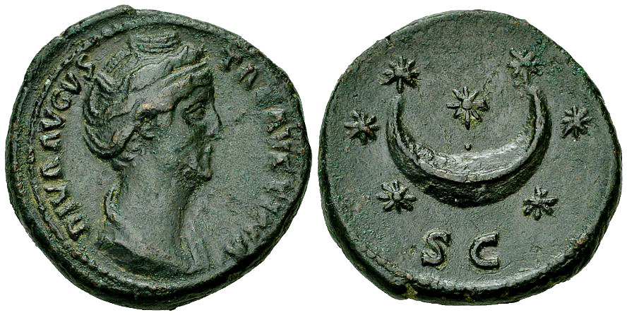 Diva Faustina I (+141 AD). AE As (27 mm, 14.22 g), Roma (Rome), c. 141-146 AD. Obv. DIVA AVGVSTA FAVSTINA, draped bust right. Rev. Crescent surrounded by seven stars. RIC III, 1199.
