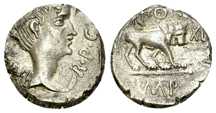 Marcus Antonius. AR Quinarius (12-13 mm, 1.90 g), Lugdunum 42 BC. Obv. III·VIR·