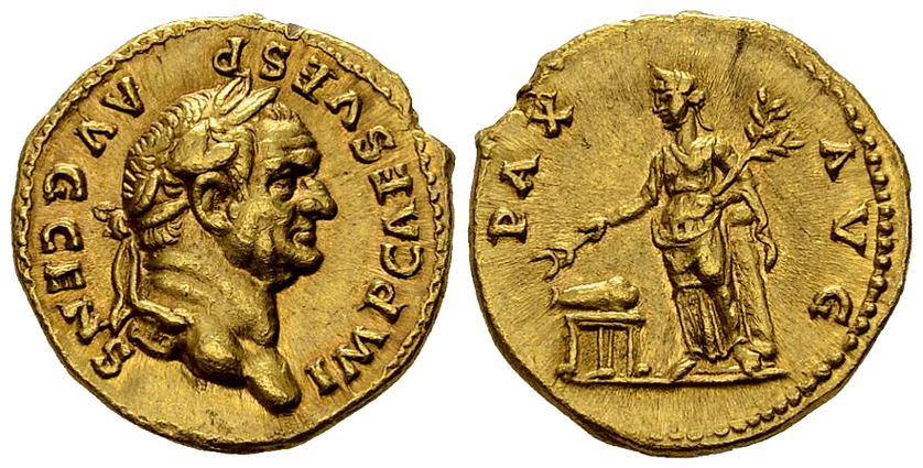 Vespasianus (69-79 AD). Aureus (19-20 mm, 7.36 g), Rome, 73 AD. Obv. IMP CAES VESP AVG CENS, Laureate head to right. Rev. PAX AVG, Pax wearing long dress and mantle, standing left, resting on column with her left arm, holding laurel branch in her left hand, with her right hand caduceus over purse on low tripod. RIC 543; BMC 96; Calicó 660.