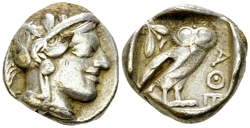 Obv. Head of Athena wearing crested helmet right. Rev. Owl standing right, head facing, olive sprig and crescent behind; all within incuse square; AΘE to right. Kroll 8, SNG Lockett 1842.