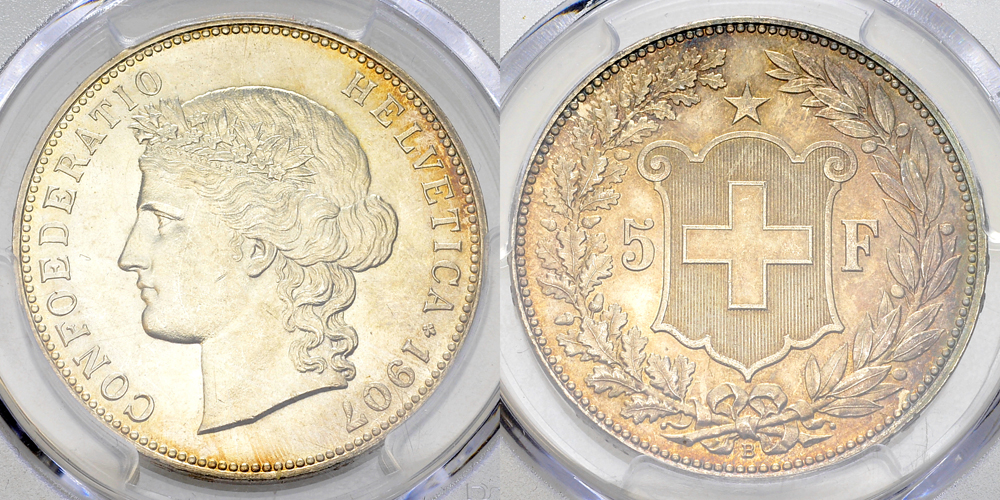 Lot 447. Schweiz, AR 5 Franken 1907 B, MS64+
