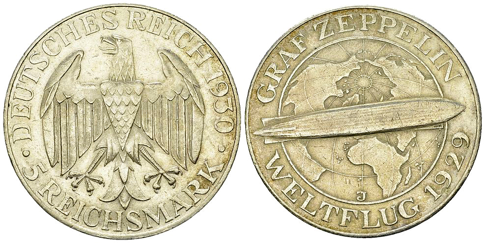 Lot 380. Weimarer Republik, AR 5 Reichsmark 1930 J, Zeppelin