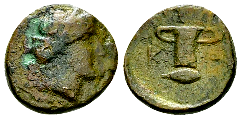 Kings of Thrace. Kersobleptes (358-341 BC). AE12 (1.93 g). Obv. Diademed female head to right. Rev. K-E-P, Container with two handles; barley-grain below.