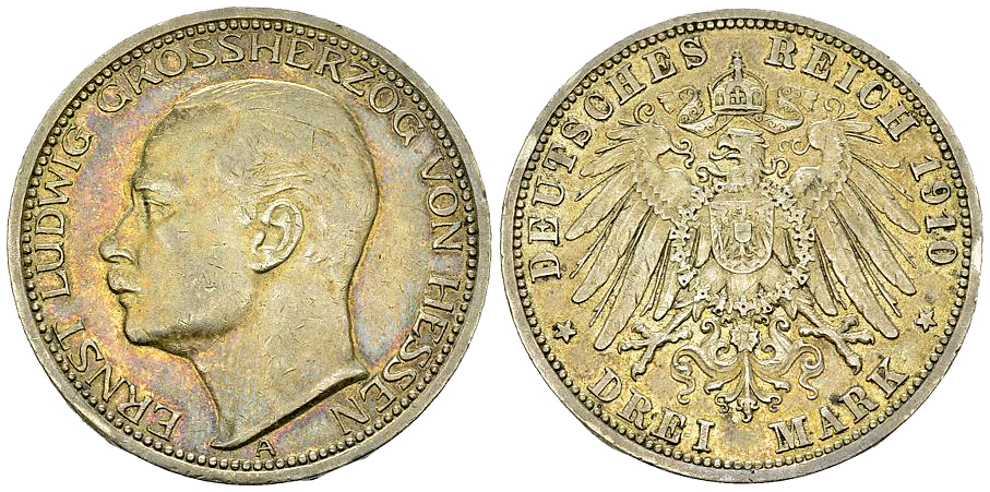 Deutschland, Hessen-Darmstadt. Ernst Ludwig (1892-1918). AR 3 Mark 1910 A (33 mm, 16.63 g).