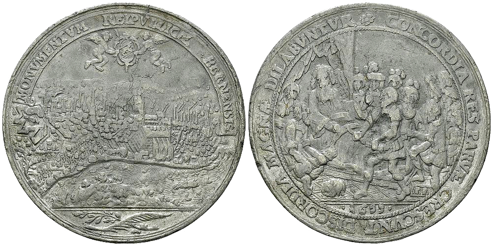 Schweiz, Bern. Zinnabschlag der Medaille 1653 (58 mm, 45.99 g). Für Verdienste bei der Unterdrückung des Bauernaufstandes. Stempel von Friedrich Fecher. Av. MONVMENTVM REIPVBLICAE BERNENSIS, Stadtansicht, darüber zwei Engel mit Berner Wappen. Rv. CONCORDIA RES PARVAE CRESCVNT DISCORDIA MAGNAE DILABVNTVR, Greis auf Sterbebett, umgeben von seinen zwölf Söhnen. Leu SM 536; Wunderly 1324.