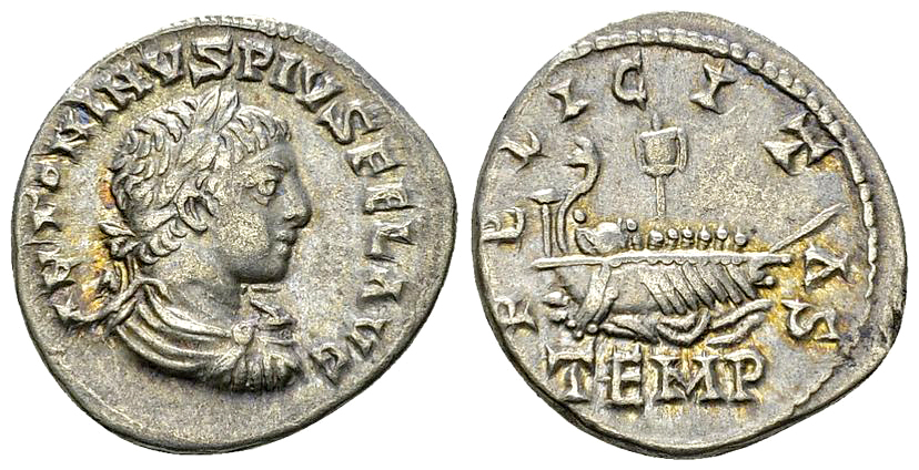 Laureate, draped and cuirassed bust to right. Rev. FELICITAS / TEMP,