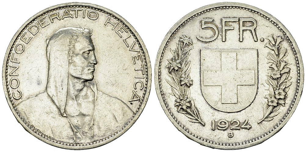 Schweiz. Eidgenossenschaft. AR 5 Franken 1924 (37 mm, 24.89 g). HMZ 2-1199d.