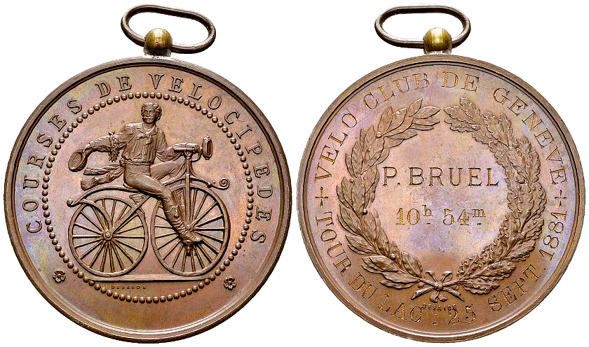 Schweiz. Genf, Stadt. AE Medaille 1881 (46 mm, 45.17 g), Courses de vélocipèdes, graviert "+VELO-CLUB DE GENEVE+, TOUR DU LAC . 25 SEPT. 1881 / P. BRUEL / 10h. 54m. Von Desaide.