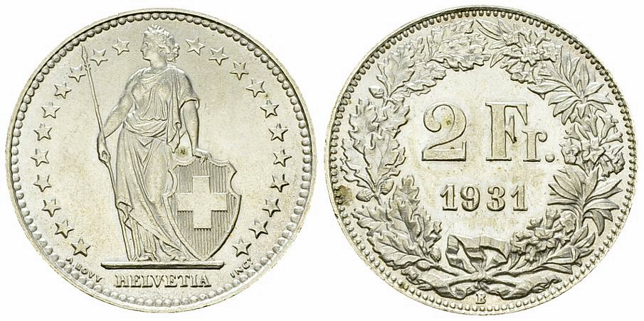 Schweiz, Eidgenossenschaft. AR 2 Franken 1931 B (10.02 g), Mzst. Bern. KM 21.