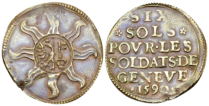 Schweiz, Genf/Genève. CU 6 Sols 1590 (26 mm, 4.93 g), Notmünze: "Pour les soldats". HMZ 2-300a.