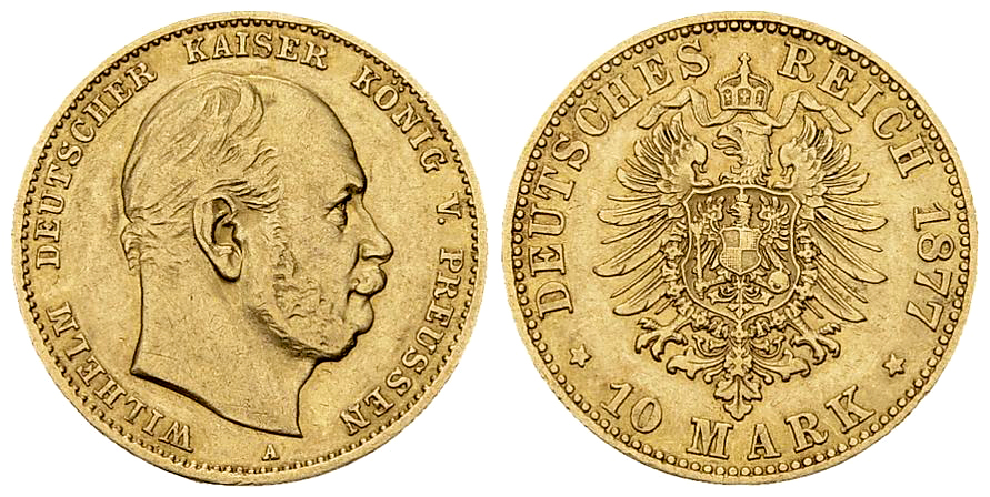 Deutschland, Preussen. Wilhelm. AV 10 Mark 1877 A (3.93 g). AKS 112.