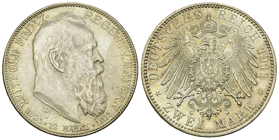 Deutschland, Bayern. Luitpold. AR 2 Mark 1911 D (11.08 g). AKS 207.