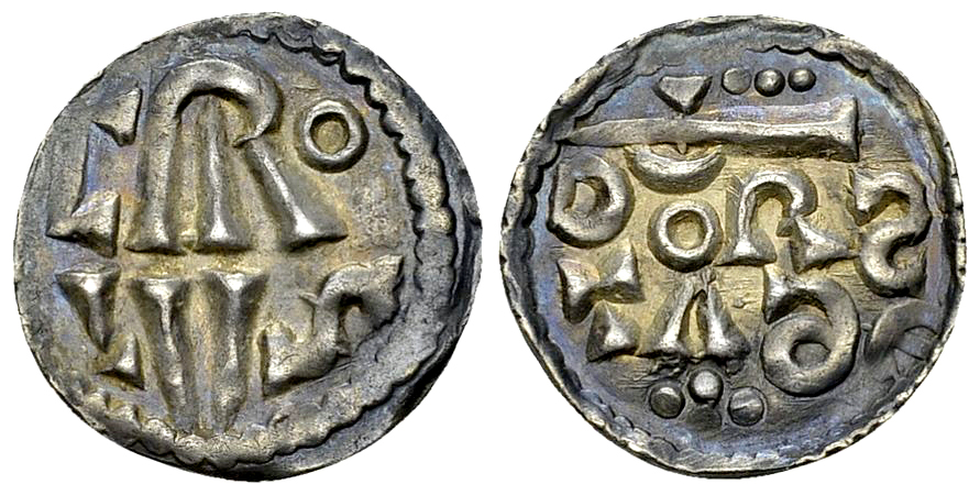 Monnaies Carolingiennes. Charlemagne (768-814). AR Denier (17 mm, 1.28 g), Dorestad. Av. CARo / LVS. Rv. DORS /